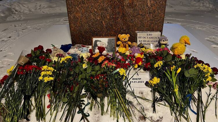 На фото также видна табличка "Днепр 14.01.23", сердечко цветов украинского флага и надпись "Зло не останется безнаказанным".