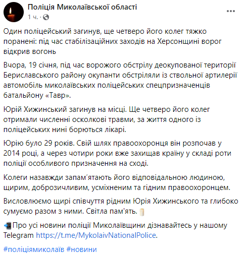 "Коллеги навсегда запомнят его ответственным человеком, искренним, доброжелательным, улыбающимся и достойным правоохранителем. Выражаем искренние соболезнования родным Юрия Хижинского и глубоко скорбим вместе с ними. Светлая память", - добавляет пресс-служба.