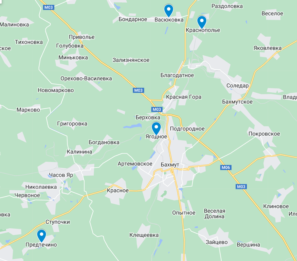 - Белогоровке, Раздоловке, Васюковке, Красной Горе, Ягодном, Бахмуте, Предтечино, Водяном и Марьинке в Донецкой области.