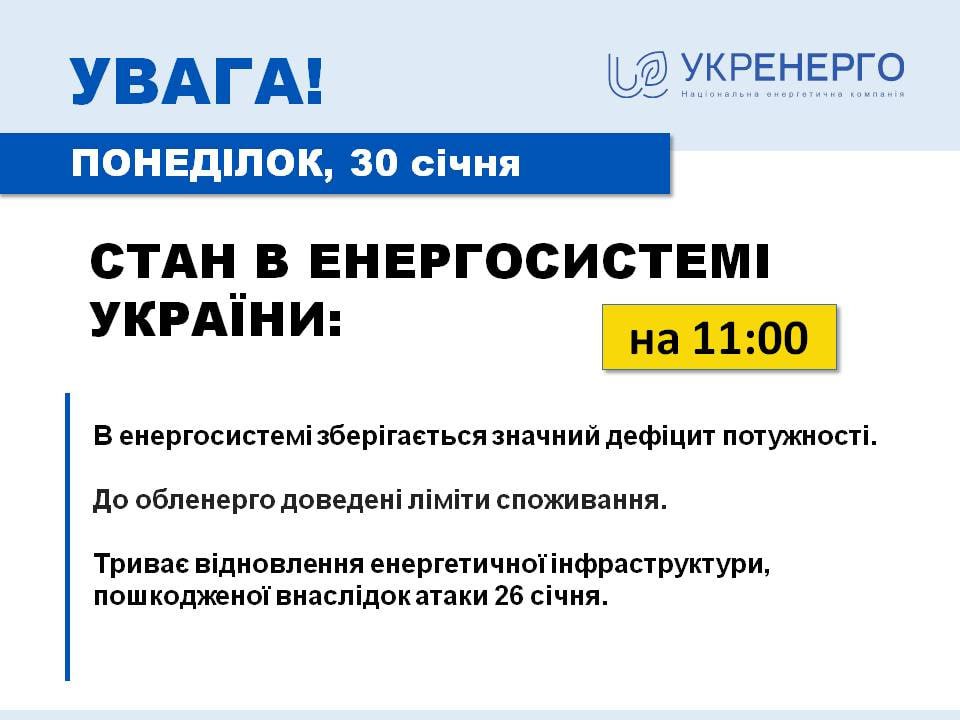 По состоянию на утро понедельника, 30 января, аварийные отключения не применялись ни в одной из областей Украины.