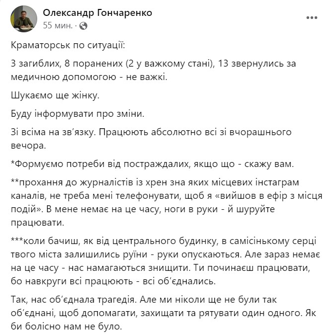 "Трое погибших, восемь раненых (двое в тяжёлом состоянии). 13 обратились за медицинской помощью - не тяжёлые. Ищем еще женщину. Буду информировать про изменения", - написал он.