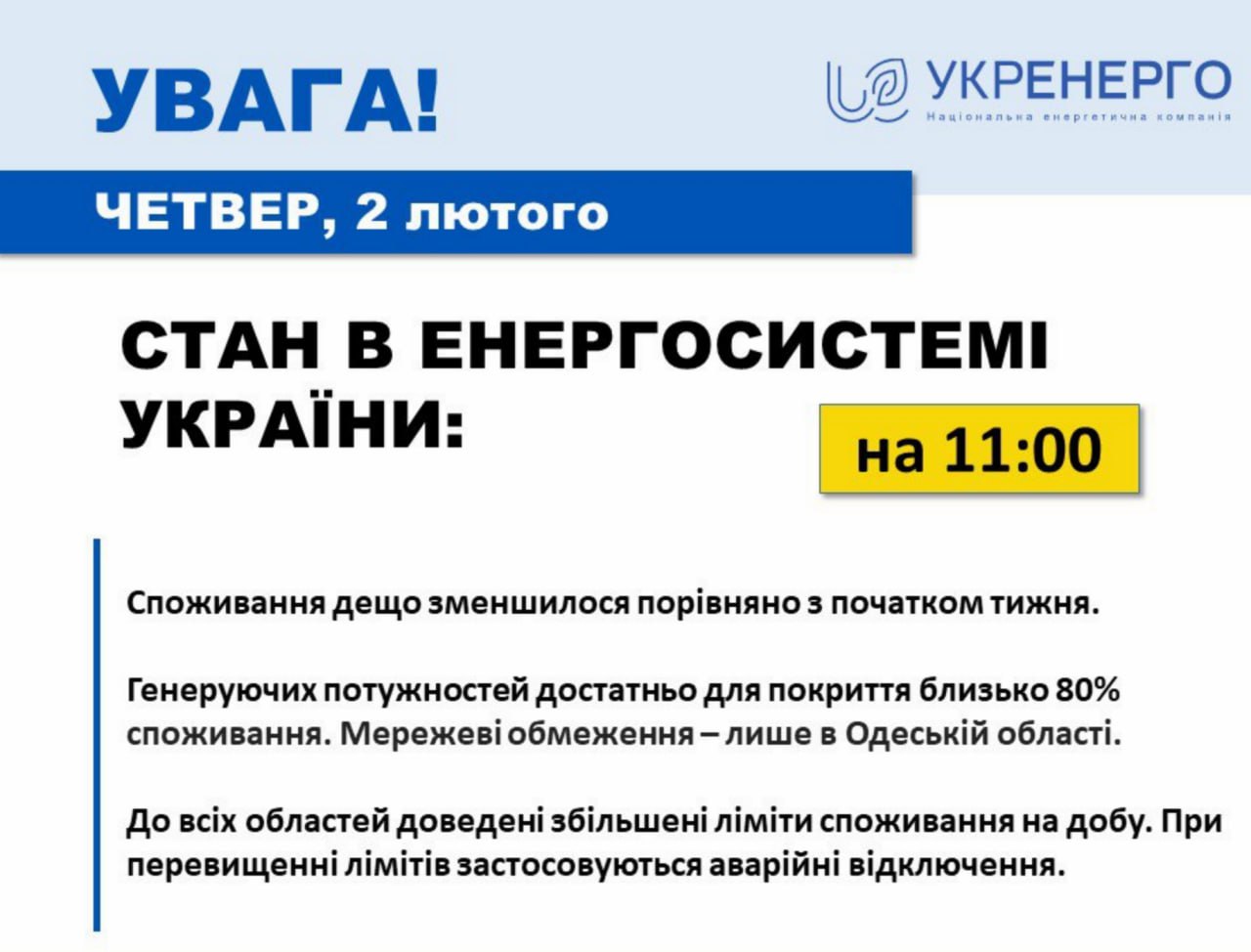 Генерирующих мощностей хватает, чтобы покрыть около 80% потребности потребления. В аварийном ремонте находятся два энергоблока электростанций в Украине.