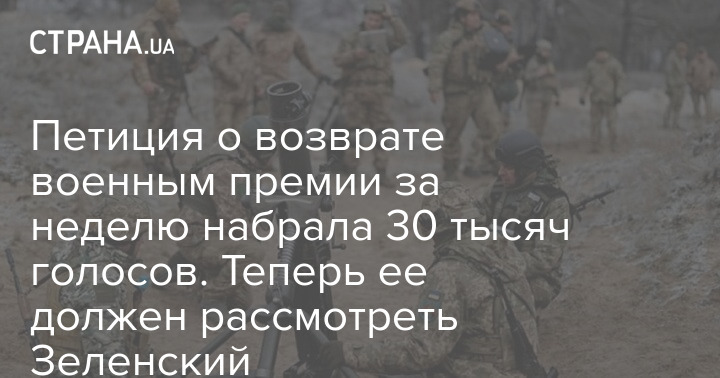 Петиция с требованием вернуть военным премию в 30 тысяч гривен за неделю набрала 30 тысяч подписей на сайте президента. Отметим, что для ее рассмотрения достаточно 25 тысяч подписей.