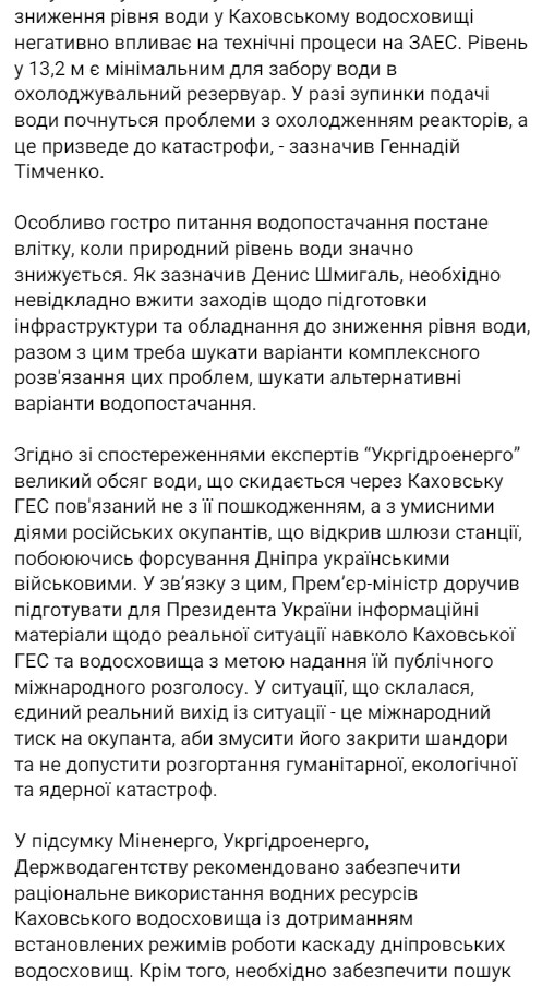 Неконтролируемый сброс воды российскими военными на Каховской ГЭС приводит к стремительному снижению воды в Каховском водохранилище. Это угрожает безопасной работе Запорожской АЭС и водоснабжению ряда украинских городов.