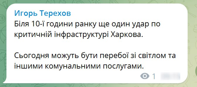 Утром 10 февраля, во время массированной ракетной атаки РФ, мэр Харькова подтвердил новый удар по городу. Прилет был по критической инфраструктуре.