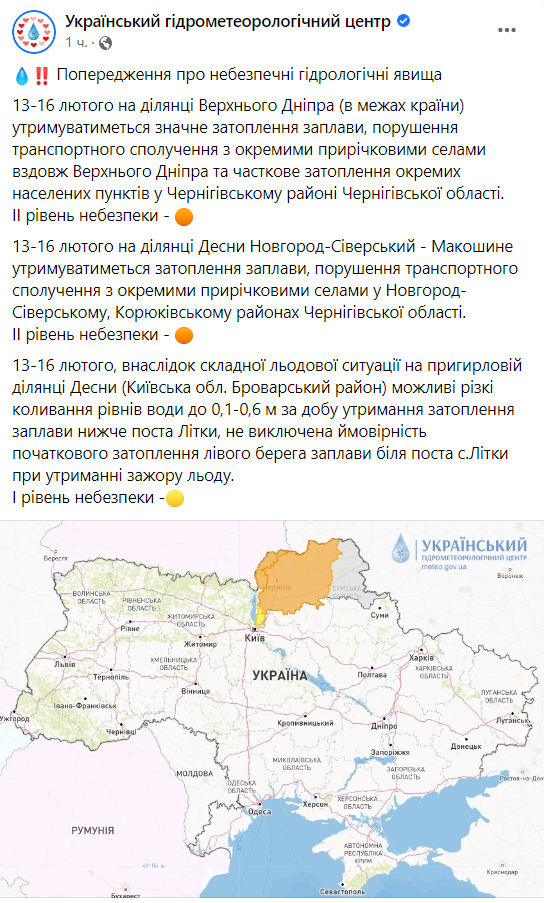 Так, с 13 по 16 февраля на участке Верхнего Днепра (в пределах страны) ожидается значительное затопление заводи, что может нарушить транспортное сообщение с отдельными приречными селами вдоль Верхнего Днепра и частично затопить отдельные населенные пункты в Черниговском районе Черниговской области. Это второй уровень опасности.