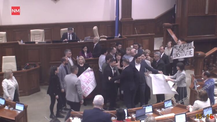 Депутаты от PAS спустились к протестующим оппозиционерам. Один из представителей парламентского большинства Виталий Жакот выхватил плакат у социалиста Александра Нестеровского. Между депутатами завязалась драка. Вероника Рошка тем временем продолжила представлять законопроект, но вскоре коммунистка Диана Караман перехватила микрофон и начала выкрикивать: "Молдова, Молдова". После этого микрофон отключили, а депутаты продолжили драку.