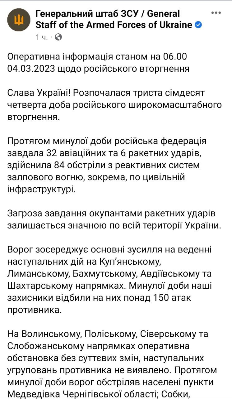 07.39 Главное из сводки Генштаба ВСУ на утро 4 марта.