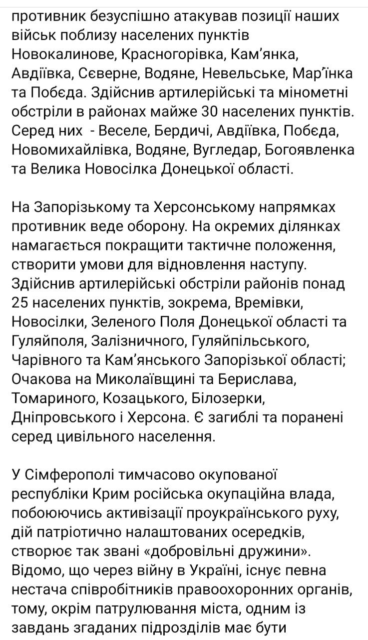 Активные обстрелы на Запорожском и Херсонском направлениях, под огнем - более 30 населенных пунктов, есть погибшие и раненые среди гражданского населения, в том числе дети.