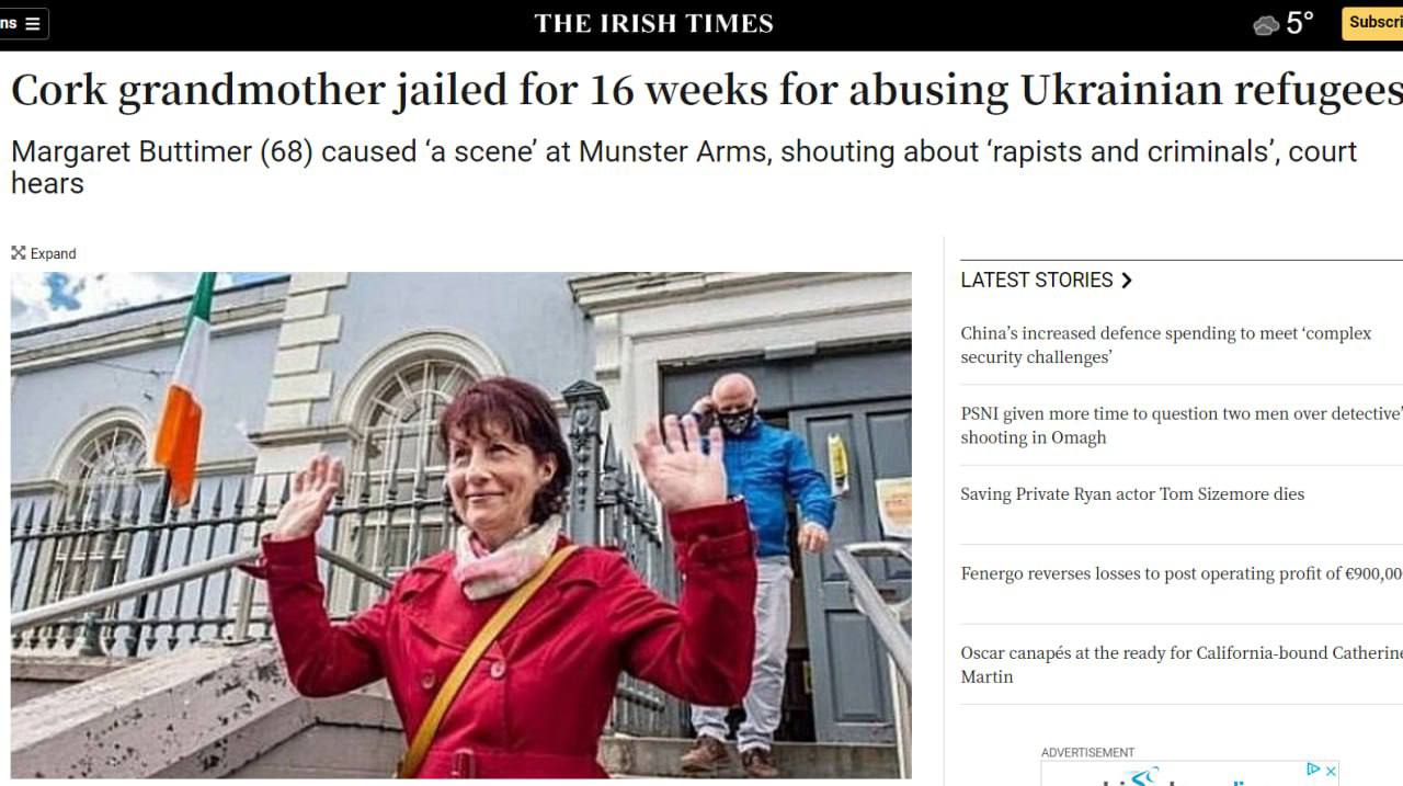 11.49 16 недель тюрьмы получила 68-летняя ирландка Маргарет Баттимер за оскорбление украинцев, приехавших в Ирландию. Впрочем, судья отсрочил приговор с условием, что "бабушка из Корка" не будет приближаться к местам пребывания украинцев.
