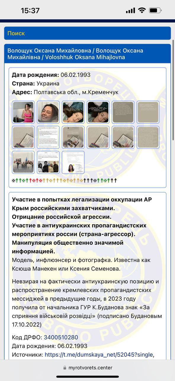 15.45 Блогершу Ксюшу Манекен, которая получила отличие от ГУР "за содействие военной разведке Украины ІІ степени, сегодня внесли в базу "Миротворец".