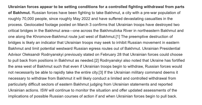 "Упреждающее разрушение мостов, вероятно, указывает на то, что украинские войска могут попытаться воспрепятствовать передвижению русских в восточной части Бахмута и ограничить потенциальные пути отхода русских из Бахмута на запад", - говорится в отчете.