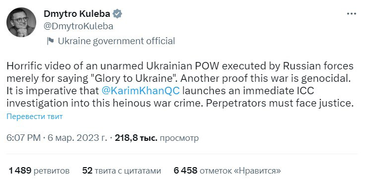 Министр иностранных дел Дмитрий Кулеба обратился к прокурору Международного уголовного суда Кариму Хану после появления в сети видео расстрела военного в форме ВСУ.
