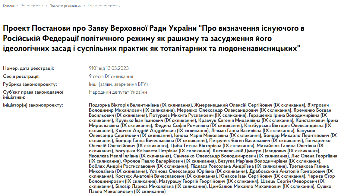 В Верховной Раде зарегистрировали проект заявления парламента, которым предлагается официально называть политический режим России "рашизмом".