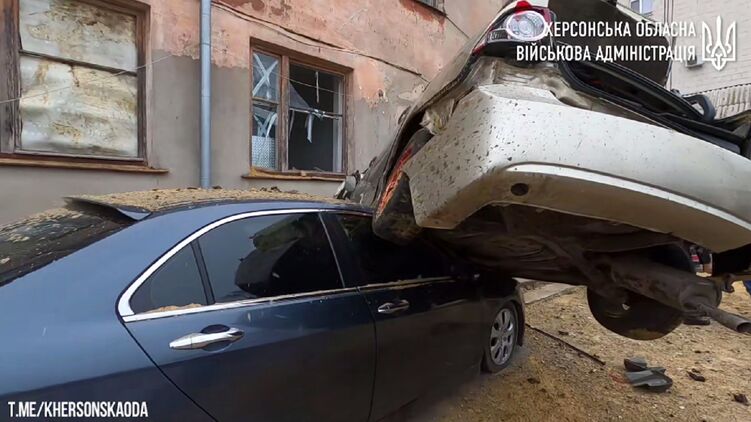 Херсонская ОВА публикует видео последствий вчерашнего обстрела медучреждения в Херсоне, где в результате удара с беспилотника взрывом одну машину закинуло на другую.