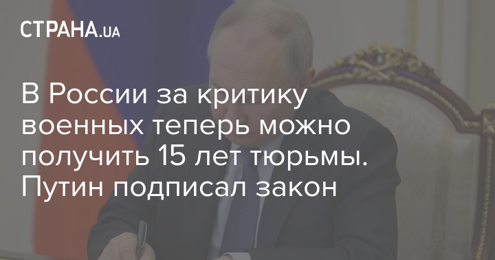 Президент РФ Владимир Путин подписал закон о наказании до семи лет лишения свободы за "дискредитацию участников спецоперации" независимо от их статуса и до 15 лет — за фейки о Вооруженных силах РФ.