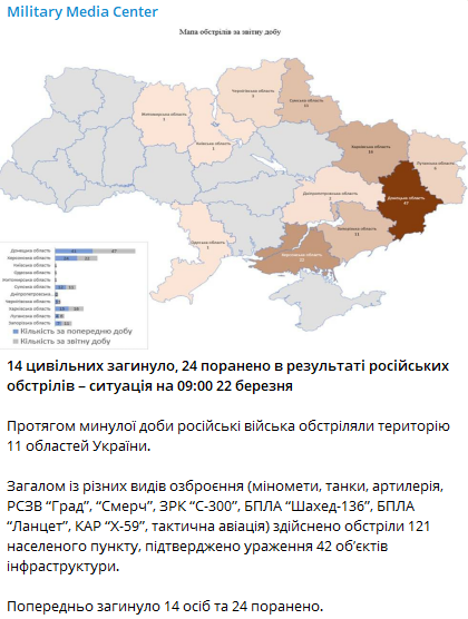 "В целом из разных видов вооружения (минометы, танки, артиллерия, РСЗО "Град", "Смерч", ЗРК "С-300", БПЛА "Шахед-136", БПЛА "Ланцет", КАР "Х-59", тактическая авиация) совершены обстрелы 121 населенного пункта, подтверждено поражение 42 объектов инфраструктуры", - говорится в сообщении.