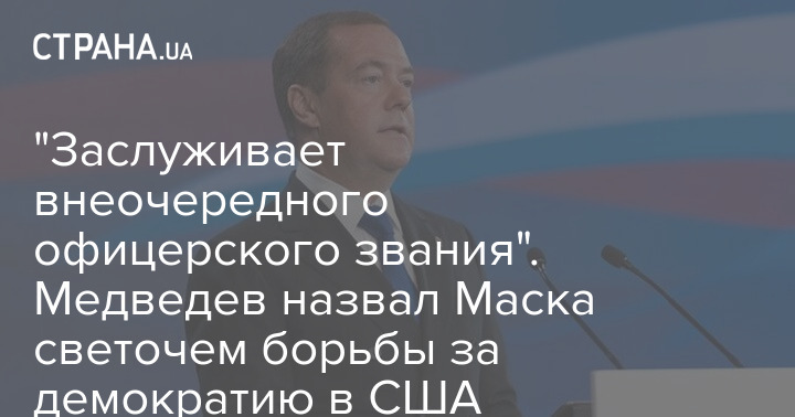 "Надеюсь здесь на Илона Маска, который является светочем борьбы за демократию в Соединенных Штатах Америки и точно заслуживает присвоения внеочередного офицерского звания", - заметил Медведев.