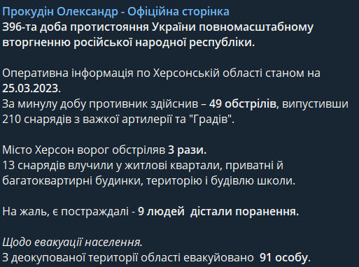 За минувшие сутки россияне 49 раз обстреляли Херсонскую область, выпустив 210 снарядов из тяжелой артиллерии и "Градов". В свою очередь Херсон армия РФ обстрелял 3 раза.