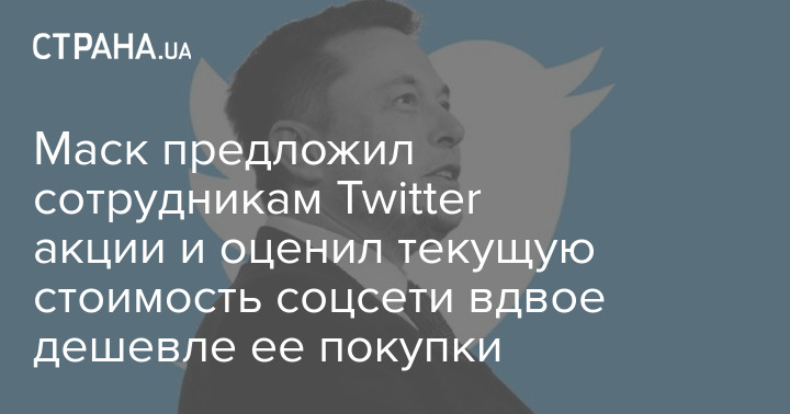 Маск предложил сотрудникам Twitter акции и оценил текущую стоимость соцсети вдвое дешевле ее покупки