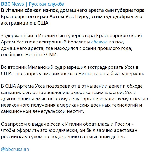 Сын губернатора Красноярского края РФ Артем Усс сбежал из-под домашнего ареста в Италии.