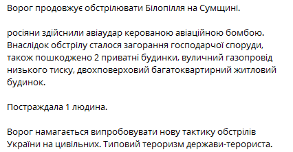 Россияне сбросили авиабомбу на Белополье Сумской области. Повреждены дома и газопровод, есть раненый