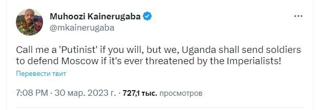 11:30 Сын президента Уганды, бригадный генерал Мухузи Кайнеругаба заявил о готовности отправить войска для обороны Москвы. "Назовите меня "путинистом", если хотите, но мы, Уганда, пошлем солдат защищать Москву, если ей когда-либо будут угрожать империалисты!" — написал он в твиттере.
