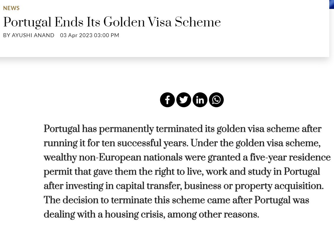 Португалия закрывает программу владельцев золотых виз: они будут в обязательном порядке конвертированы в обычные виды на жительство.