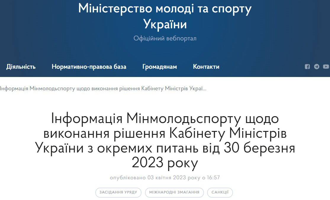 Министерство молодёжи и спорта Украины разработало проект постановления Кабмина, согласно которому украинскую спортивную федерацию могут лишить статуса всеукраинской, если ее спортсмены примут участие в соревнованиях, где будут россияне и белорусы. А сами спортсмены могут попасть под санкции СНБО.