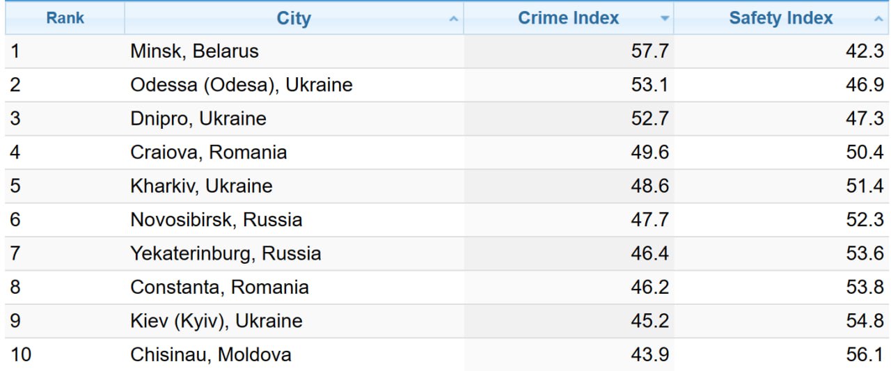 В обновленный рейтинг вошли два российских города - Новосибирск и Екатеринбург (7 и 8 места). На первое место по криминогенности в Восточной Европе составители поставили Минск, а на десятое - Кишинев.