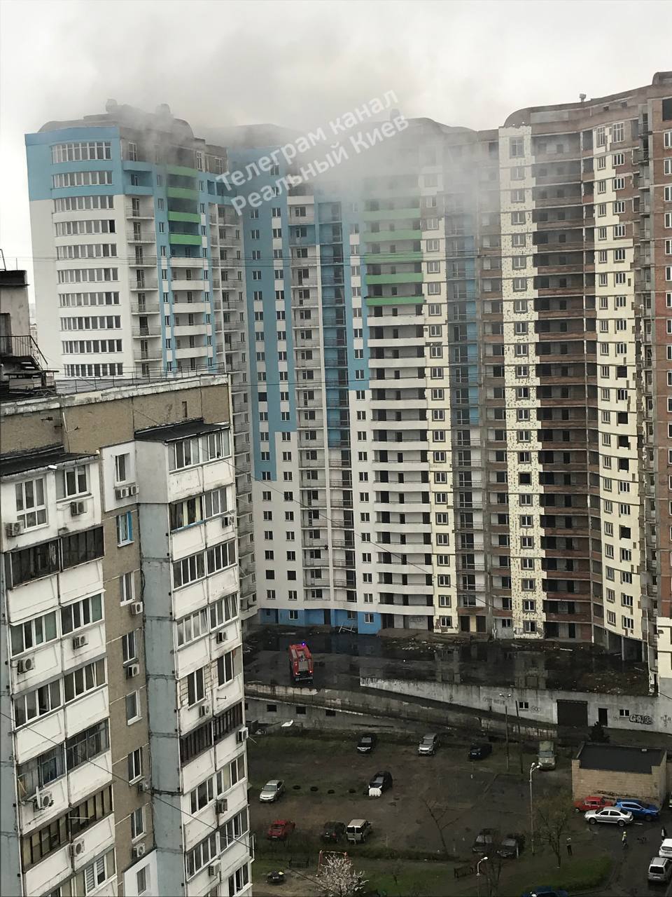 В Киеве на Позняках горит недострой на улице Здолбуновской. Судя по фото, горят верхние этажи 25-этажного здания.