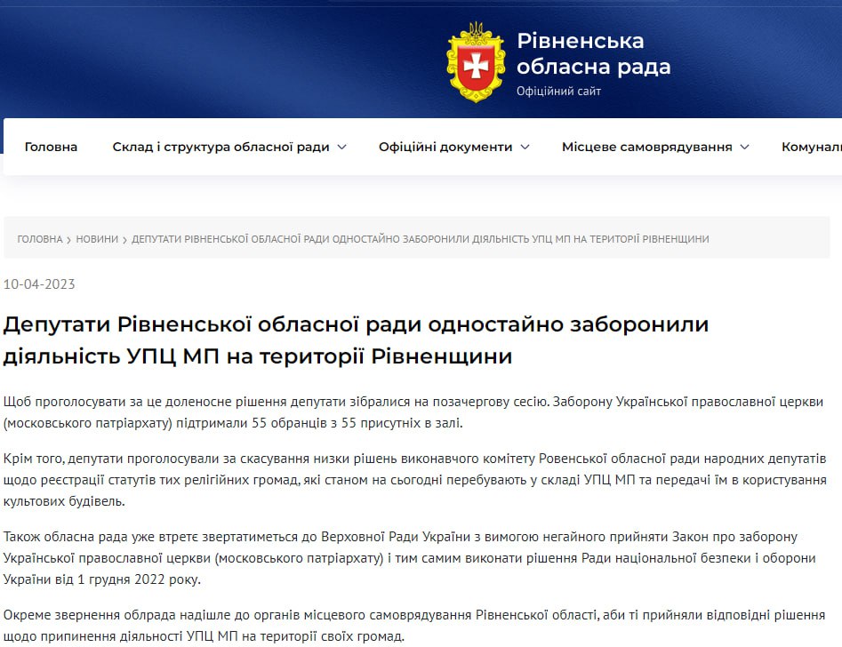Ровенский облсовет единогласно проголосовал за запрет деятельности УПЦ на территории области. Ранее сегодня горсовет Ровно проголосовал за лишение УПЦ права пользования земельными участками в городе.