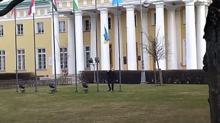 Украинский флаг был сорван с флагштока возле Таврического дворца в центре Санкт-Петербурга.