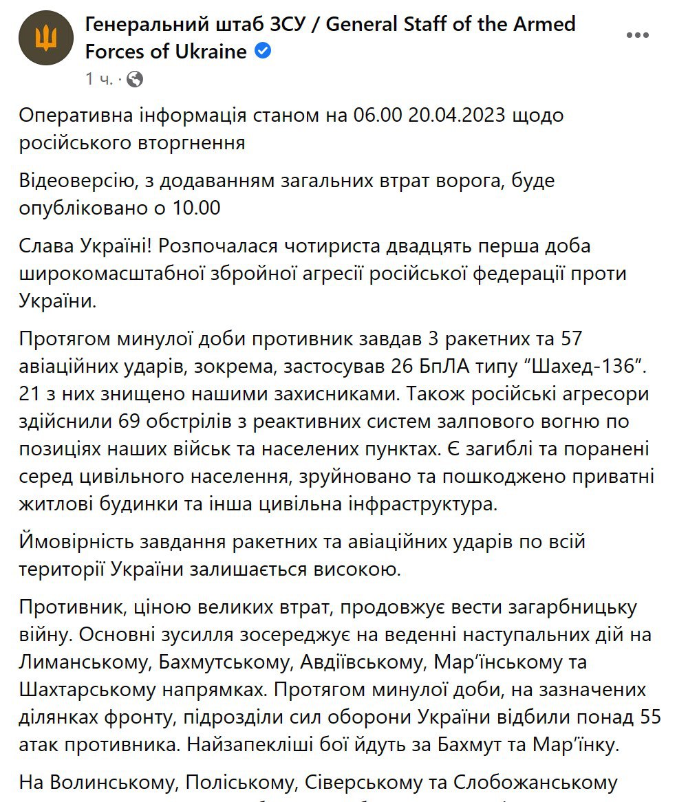 ВСУ отразили более 55 атак противника. Также за прошедшие сутки россияне применили 26 "Шахидов", 21 из них уничтожен.