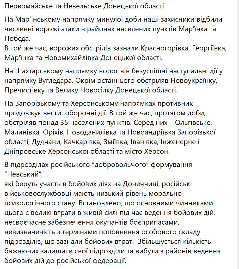 - На Авдеевском направлении - попытки наступления РФ в районах Авдеевки, Водяного и Первомайского.