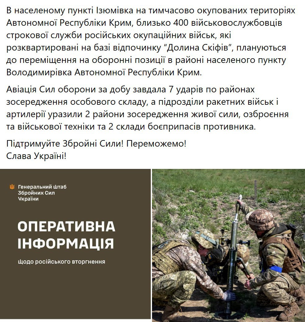 Об этом сообщается в утренней сводке Генштаба ВСУ.