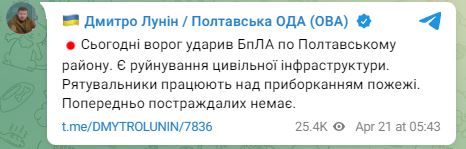 В пятницу, 21 апреля, россияне ударили по Полтавскому району Полтавской области из беспилотников.