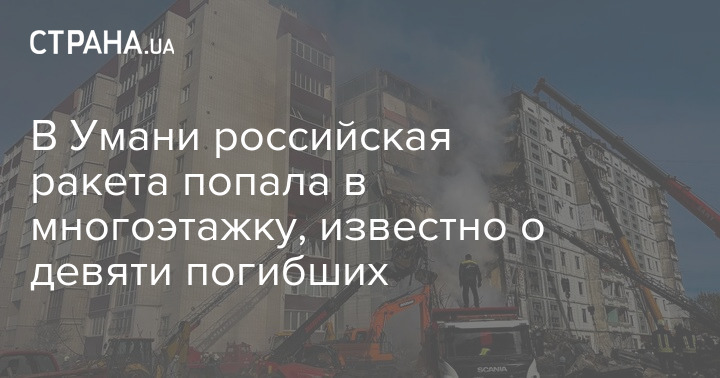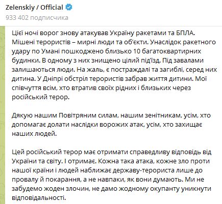 "В результате ракетного удара по Умани повреждено около 10 многоквартирных домов. В одном из них уничтожен целый подъезд. Под завалами остаются люди. К сожалению, есть пострадавшие и погибшие, в том числе ребенок", - написал Зеленский.