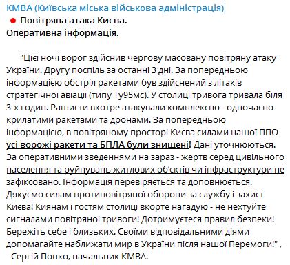 По предварительной информации, в воздушном пространстве Киева силами ПВО все ракеты и дроны были уничтожены, - сообщил глава КГВА.