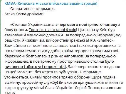 Киев подвергся очередному воздушному нападению со стороны РФ (третьего за последние шесть дней). В этот раз Киев был атакован исключительно дронами. По предварительной информации, это были иранские БПЛА Shahed.