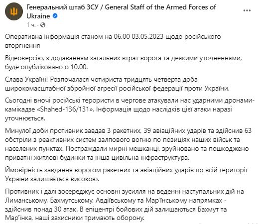 В среду, 3 мая, Генштаб ВСУ обнародовал сводку о ситуации за минувшие сутки.