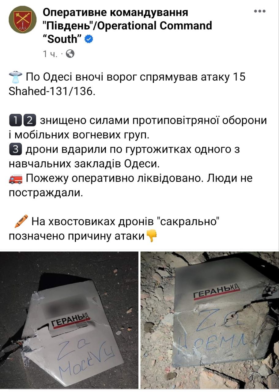 07.35 В Одессе был прилет трёх "Шахидов" по зданиям общежитий. Пострадавших нет, сообщили в оперативном командовании "Юг".