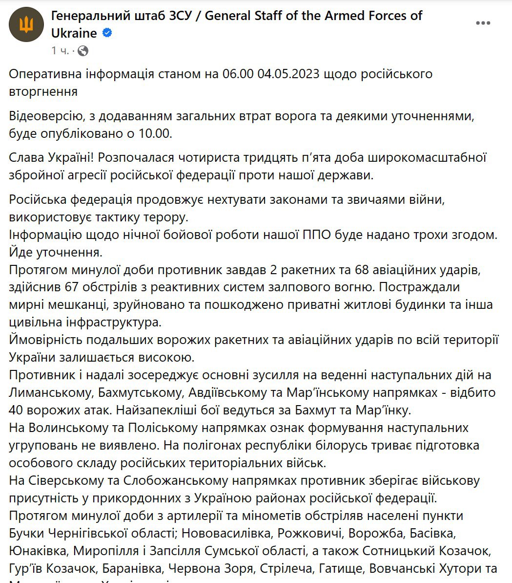 В четверг, 4 мая, в Украине идет уже 435-й день войны с РФ.