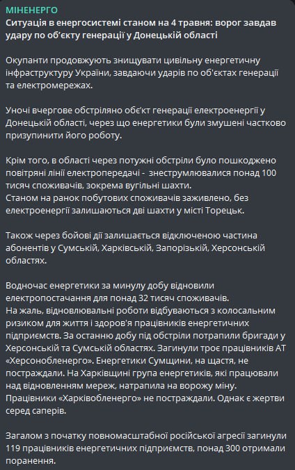 10.52 Противник ударил по объекту генерации в Донецкой области, сообщает Минэнерго.