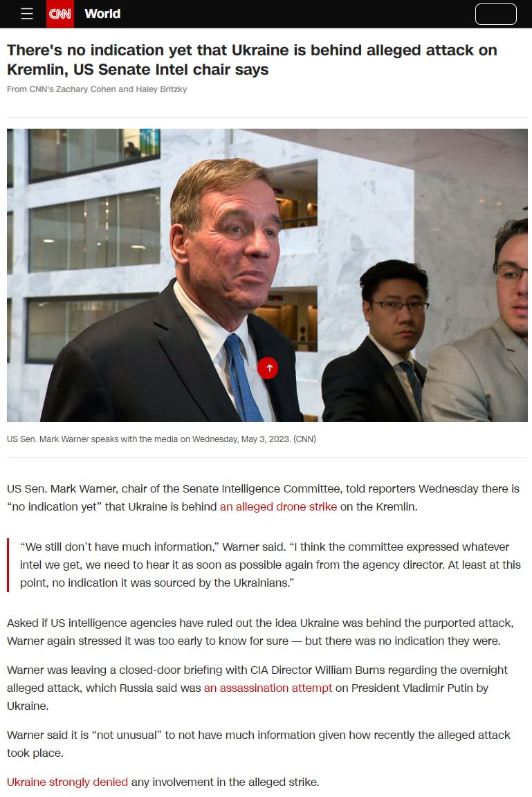 11.43 Председатель сенатского комитета по разведке сенатор США Марк Уорнер заявил, что "пока нет никаких признаков" того, что Украина стоит за предполагаемым ударом беспилотника по Кремлю.