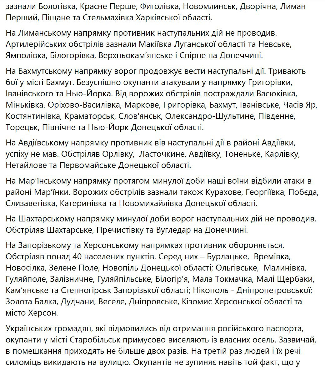 - Продолжаются бои в Бахмуте. Также шли атаки в направлении Григорьевки, Ивановского и Нью-Йорка.