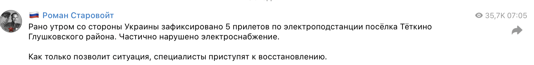 Губернатор Курской области РФ Роман Старовойт обвинил Украину в обстреле электроподстанции в посёлке Тёткино.