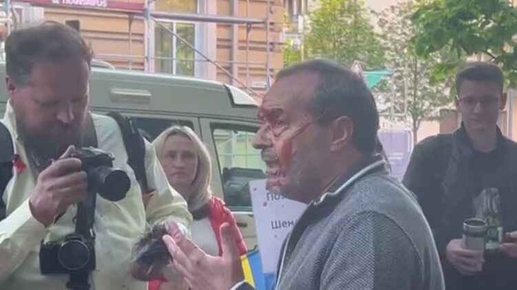 Писателя Шендеровича в Вильнюсе облил кетчупом российский активист c украинским флагом. Видео