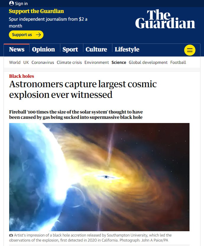 Астрономы из Великобритании зафиксировали самый крупный космический взрыв в истории. Он произошел из-за поглощения сверхмассивной черной дырой огромного облака газа.