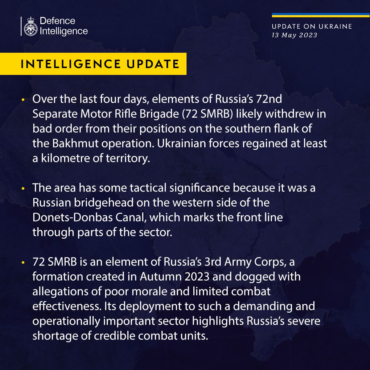 В разведке отмечают, что 72-я ОМСБр является подразделением 3-го армейского корпуса РФ, созданного осенью 2022 года и обвиняемого в плохом моральном духе и ограниченной боеспособности.